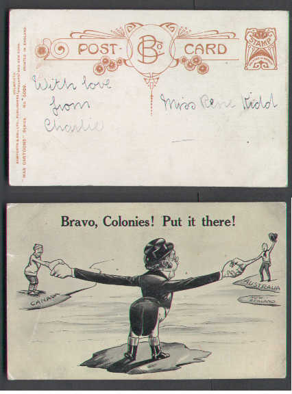 #5441-unused patriotic-view-cartoon"Bravo Colonies,put it there !"-Member of the Canadian Stamp Dealers Association and have been serving the collecto...