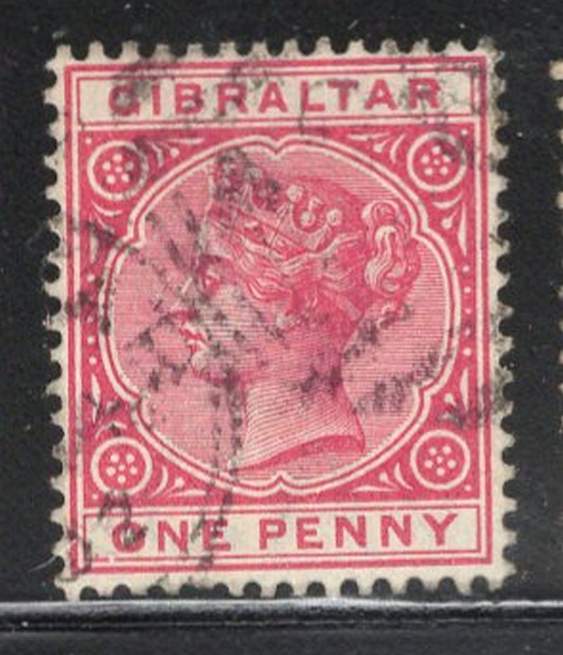 Gibraltar Scott Catalogue number 11 1898 1 d carmine rose Victoria stamp.Used, very good to fine .Canadian Customers - no added GST/HSTUS customers - No tariffs on stamps sent by meMember Canadian Stamp Dealers Association.br26-4-2.jpg
