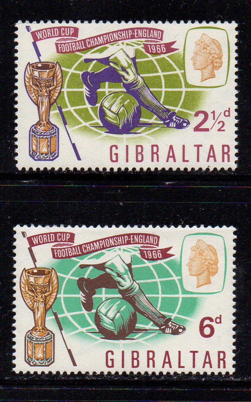 Gibraltar Scott Catalogue number 175-176 1966 Soccer World Cup stamp set .Mint, fine to very fine, original gum never hinged .Member Canadian Stamp Dealers Association .Free Shipping on purchases over $50 going to Canada or the USA .Canadian Customers - I pay the GST/HST on your purchases from me .
