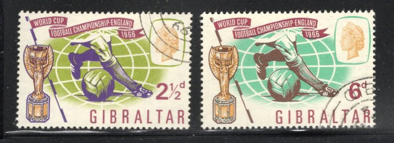 Gibraltar Scott Catalogue number 175-176 1966 Soccer World Cup stamp set .Used fine to very fineCanadian Customers - no added GST/HSTUS customers - No tariffs on stamps sent by meMember Canadian Stamp Dealers Associationbr26-4-25.jpg
