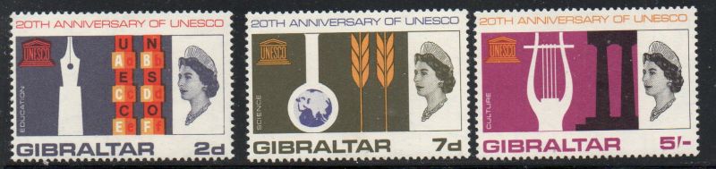 Gibraltar Scott Catalogue number 183-185 1966  20th Anniversary of UNESCO stamp set .Mint, fine to very fine, original gum never hinged .Member Canadian Stamp Dealers Association .Canadian Customers - I pay the GST/HST on your purchases from me .