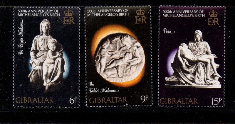 Gibraltar Scott Catalogue number 326-328 1975 Michelangelo Sculptures stamp set . Mint, fine to very fine, original gum never hinged .Member Canadian Stamp Dealers Association .Canadian Customers - I pay the GST/HST on your purchases from me .