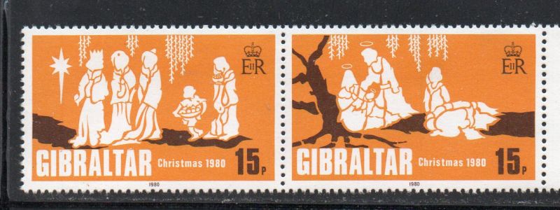 Gibraltar Scott Catalogue number 389a 1980 Christmas stamp pair .Mint, fine to very fine, original gum never hinged .Member Canadian Stamp Dealers Association .Canadian Customers - I pay the GST/HST on your purchases from me .