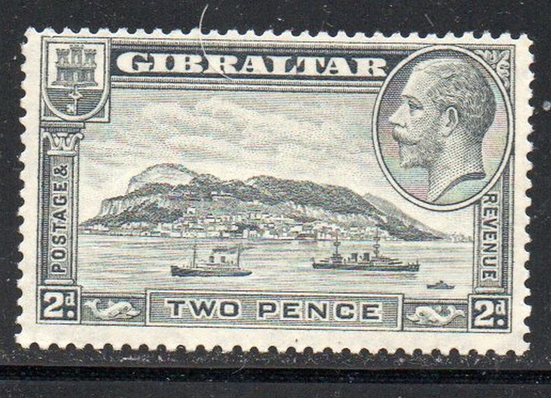 Gibraltar Scott Catalogue number 98 1932 2 d gray George V, Rock of Gibraltar & Ships stamp .Mint, fine to very fine, original gum hinged .Member Canadian Stamp Dealers Association .Canadian Customers - I pay the GST/HST on your purchases from me .25-7-43.jpg