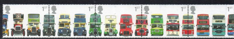 Great Britain Scott Catalogue number 1976a 2001 Buses stamp strip of 5 .Mint, fine to very fine original gum never hinged .Canadian Customers - I pay the GST/HST for youMember Canadian Stamp Dealers Association