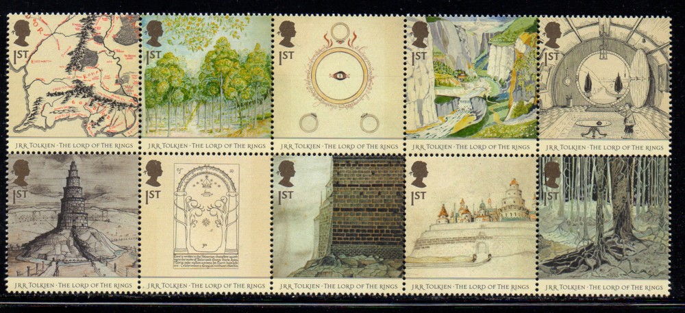 Great Britain Scott Catalogue number 2192a 2004 Lord of the Rings by J.R. Tolkein block of 10 stamps .Mint, fine to very fine original gum never hinged .Canadian Customers - I pay the GST/HST for youMember Canadian Stamp Dealers Association