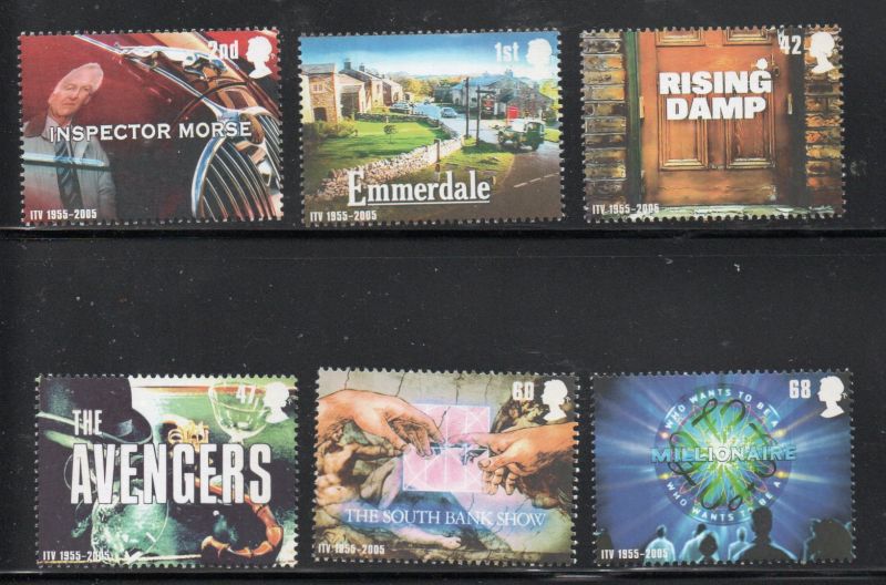 Great Britain Scott Catalogue number 2308-2313 2005 TV Shows stamp set .Mint, fine to very fine original gum never hinged .Canadian Customers - I pay the GST/HST for youMember Canadian Stamp Dealers Association