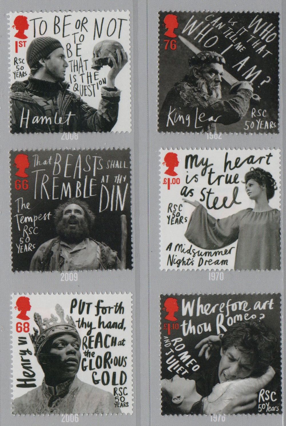 Great Britain Scott Catalogue number 2894-2899 2011 50th Anniversary Royal Shakespeare Company, Stratford-on-Avon,  stamp set.Mint, fine to very fine original gum never hinged .Canadian Customers - I pay the GST/HST for youMember Canadian Stamp Dealers Association