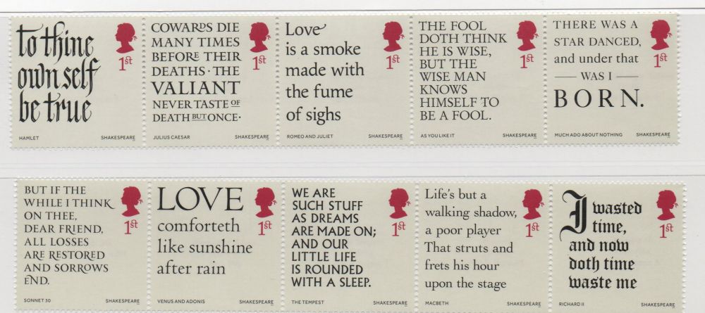Great Britain Scott Catalogue number 3485-3494 2016 Shakespeare Quotations stamp set .Mint, fine to very fine original gum never hinged .Canadian Customers - I pay the GST/HST for youMember Canadian Stamp Dealers Association