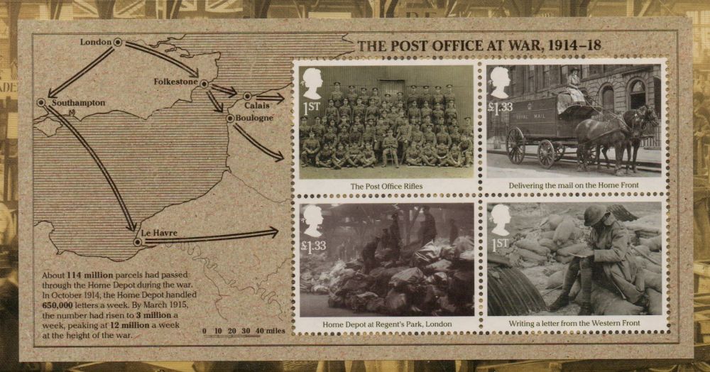 Great Britain Scott Catalogue number 3513 2016 Cl Post Office at War, WW I, stamp souvenir sheet .Mint, fine to very fine original gum never hinged .Canadian Customers - I pay the GST/HST for youMember Canadian Stamp Dealers Association