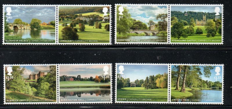 Great Britain Scott Catalogue number 3530-3537 2016 Landscape Gardens designed by Lancelot Brown stamp set .