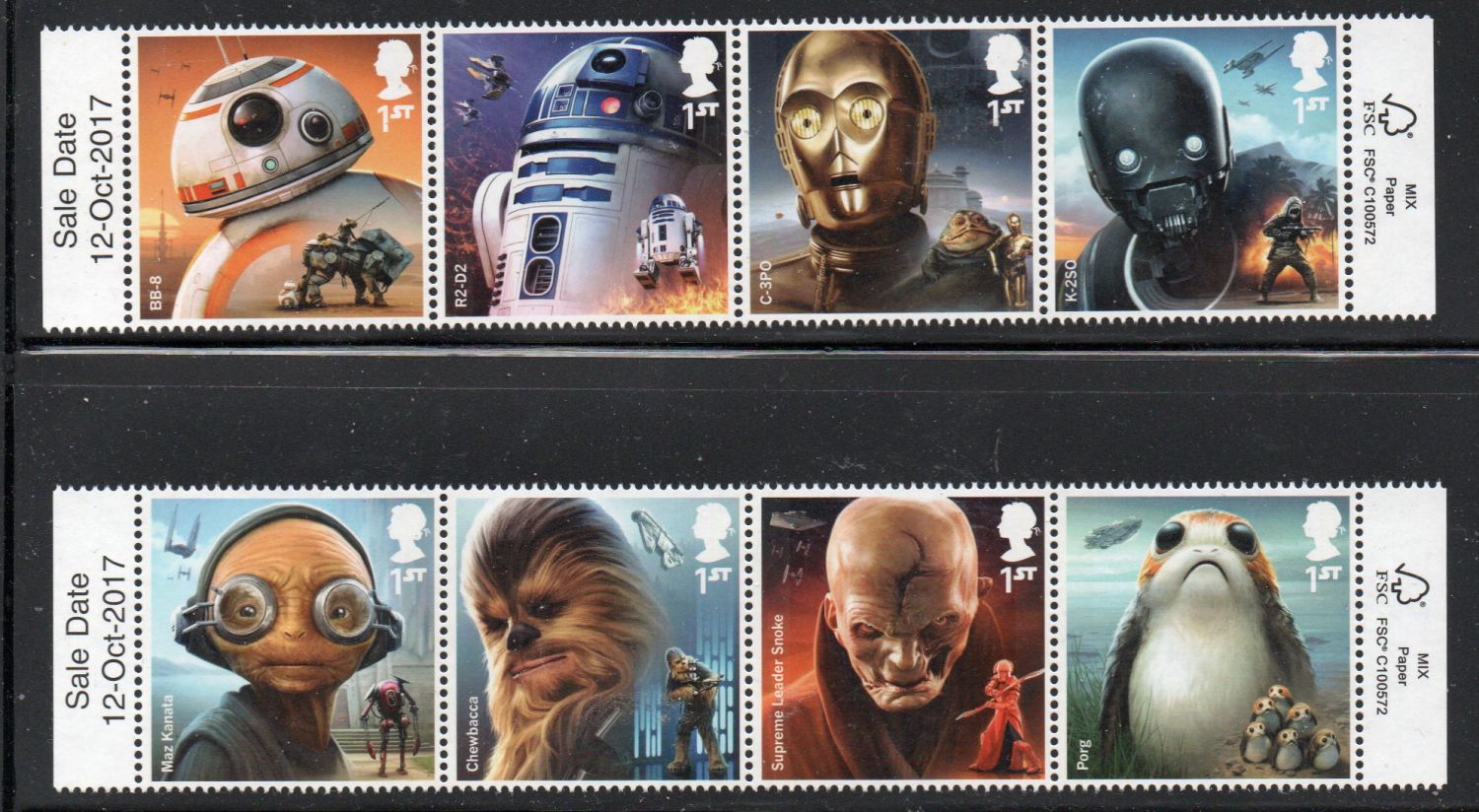 Great Britain Scott Catalogue number 3656-3663 2017 Star Wars Droids & Aliens stamp set.