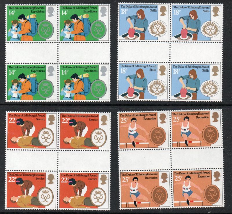 Great Britain Scott Catalogue number 952-955 1981 Duke of Edinburgh Awards stamp set in blocks of 4.Mint, fine to very fine, original gum never hinged .Member Canadian Stamp Dealers Association .Free Shipping on purchases over $50 going to North America .Canadian Customers - I pay the GST/HST on your purchases from me .21-8-152.jpg