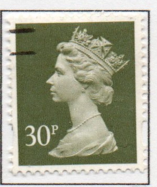 Great Britain Scott Catalogue number MH219 1993 30p olive green QE II Machin Head stamp .Used fine to very fine .Member Canadian Stamp Dealers Association .Free Shipping on purchases over $50 going to Canada or the USA .Canadian Customers - I pay the GST/HST on your purchases from me .