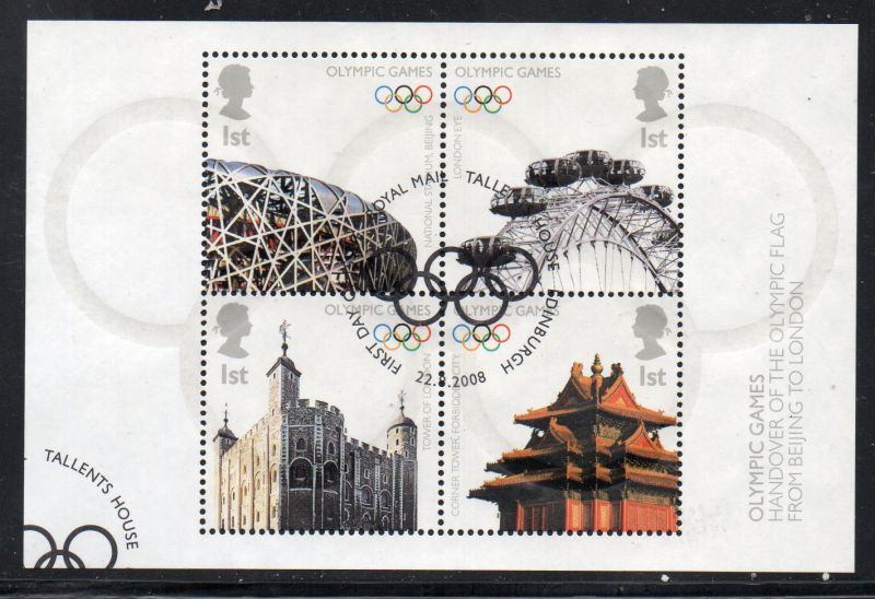 Great Britain Scott Catalogue number 2593 2008 Beijing & London Olympics stamp souvenir sheet.Used, fine to very fine .Canadian Customers - no added GST/HSTUS customers - No tariffs on stamps sent by meMember Canadian Stamp Dealers Association