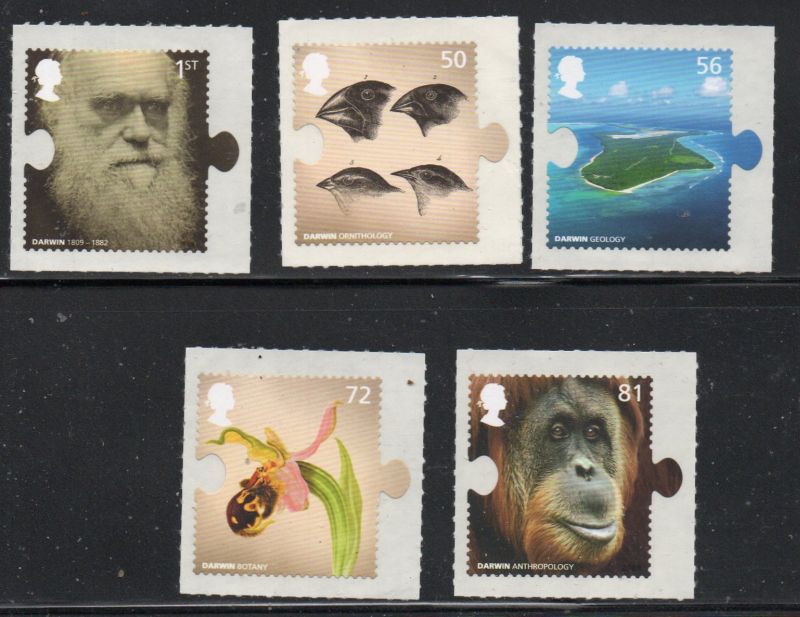 Great Britain Scott Catalogue number 2633-2637 2009 Darwin self adhesive stamp set .Mint, fine to very fine, original gum never hinged .Member Canadian Stamp Dealers Association .Canadian Customers - I pay the GST/HST on your purchases from me .