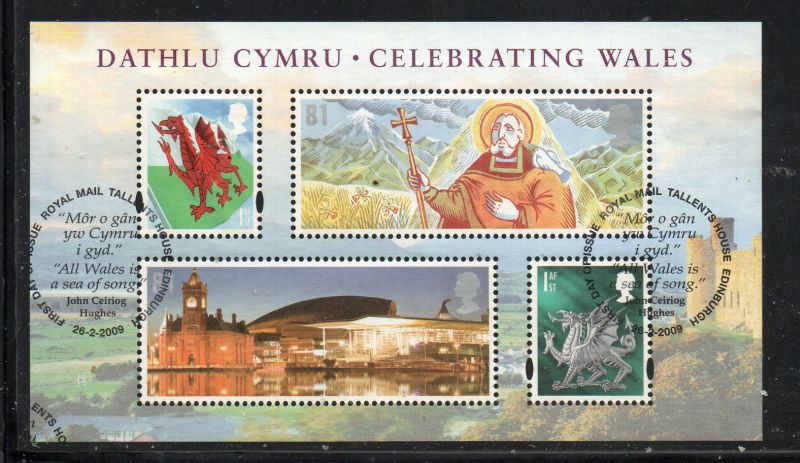 Great Britain Scott Catalogue number 2639 2009 Celebrating Wales stamp souvenir sheet.Used, fine to very fine .Canadian Customers - no added GST/HSTUS customers - No tariffs on stamps sent by meMember Canadian Stamp Dealers Association
