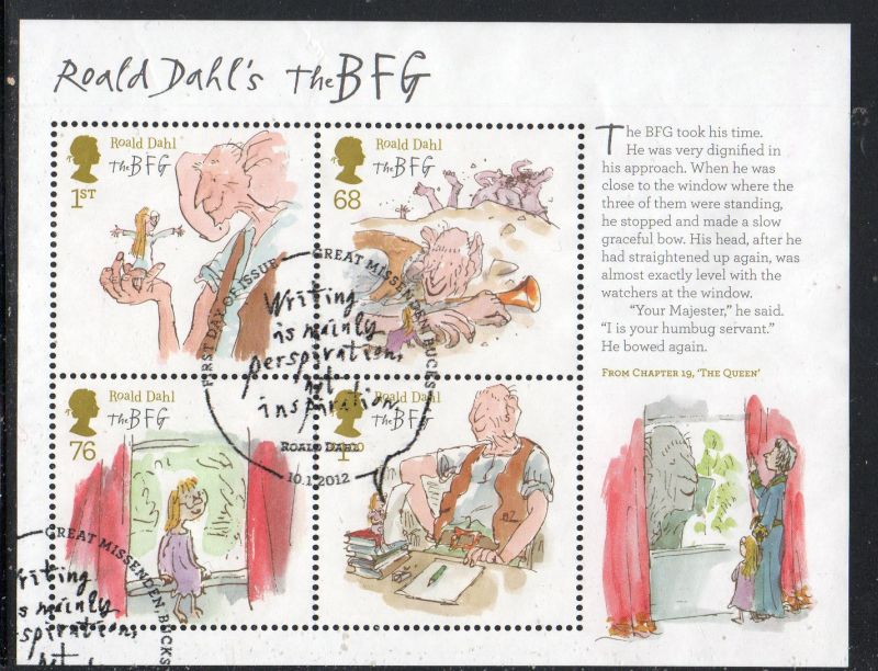 Great Britain Scott Catalogue number 2989 2012 Roald Dahl Characters stamp souvenir sheet.Used, fine to very fine .Canadian Customers - no added GST/HSTUS customers - No tariffs on stamps sent by meMember Canadian Stamp Dealers Association
