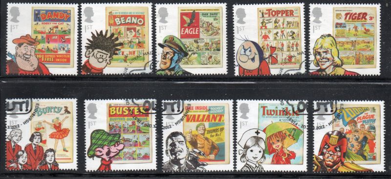 Great Britain Scott Catalogue number 3008-3017 2012 Comic Book Covers & Characters stamp set.Used, fine to very fine .Canadian Customers - no added GST/HSTUS customers - No tariffs on stamps sent by meMember Canadian Stamp Dealers Association