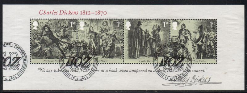 Great Britain Scott Catalogue number 3043 2012 Charles Dickens stamp souvenir sheet.Used, fine to very fine .Canadian Customers - no added GST/HSTUS customers - No tariffs on stamps sent by meMember Canadian Stamp Dealers Association
