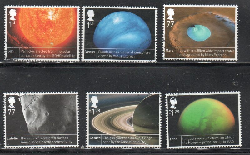 Great Britain Scott Catalogue number 3113-3118 2012 Astronomical Bodies stamp set.Used, fine to very fine .Canadian Customers - no added GST/HSTUS customers - No tariffs on stamps sent by meMember Canadian Stamp Dealers Association