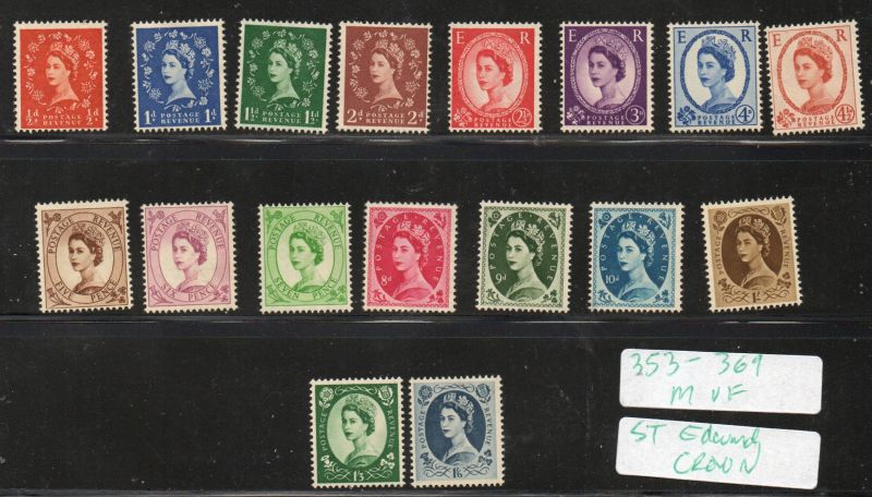 Great Britain Scott Catalogue number 353-369 1958 QE II stamp set with St Edward Crown watermark.