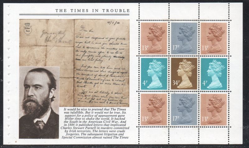 Great Britain Scott Catalogue number  MH149a 1983 QE II II Machin Head stamps booklet pane, 2 x 4p, 4 x 13p, 2 x 17p, 1 x 34p from The Times Booklet BK 147 .Mint, fine to very fine, original gum never hinged .Member Canadian Stamp Dealers Association .Canadian Customers - I pay the GST/HST on your purchases from me .25-6-100.jpg