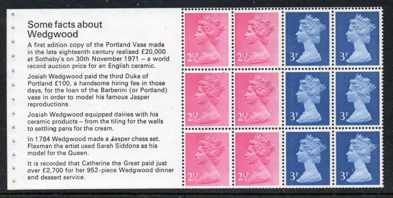 Great Britain Scott Catalogue number MH36d 1972 QE II Machin stamp Wedgwood booklet pane 6 x 2/12 p, 6 x 3 p .