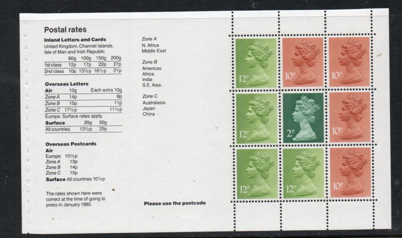 Great Britain Scott Catalogue number MH78b 1980 QE II II Machin Head stamps,1 x 2p, 4 x 10p, 4 x 12 p from Wedgwood Booklet .