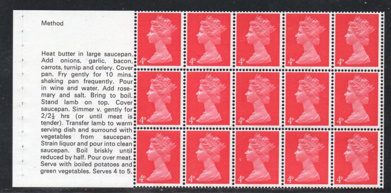 Great Britain Scott Catalogue number MH7d 4d red QE II Machin Head stamp booklet pane of 15 with Lamb Recipe on selvedge.