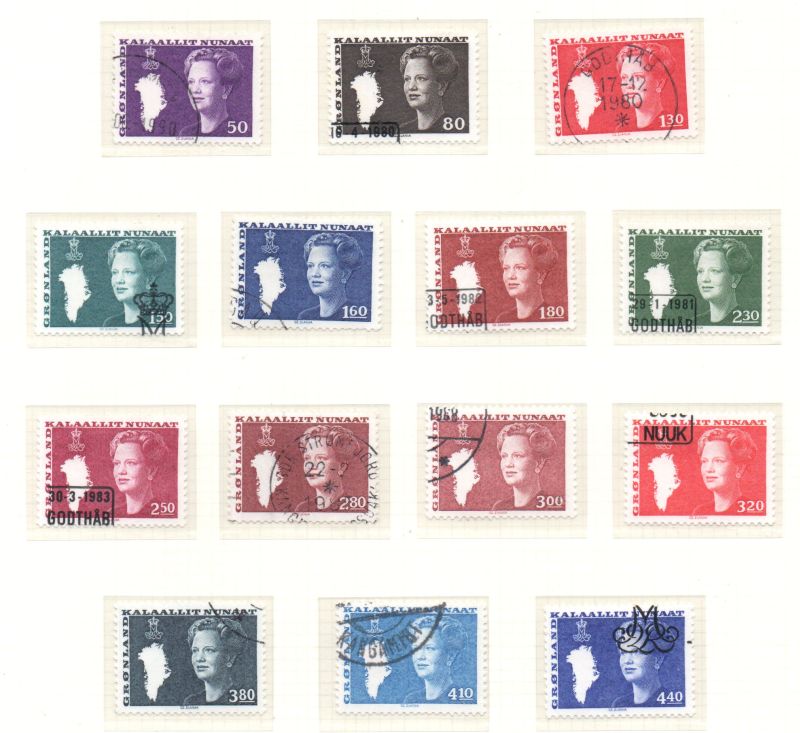Greenland Scott Catalogue number 120-35 1980-1989 Queen Margrethe stamp set.Used, fine to very fine .Canadian Customers - I pay the GST/HST on your purchases from me .Member Canadian Stamp Dealers Association