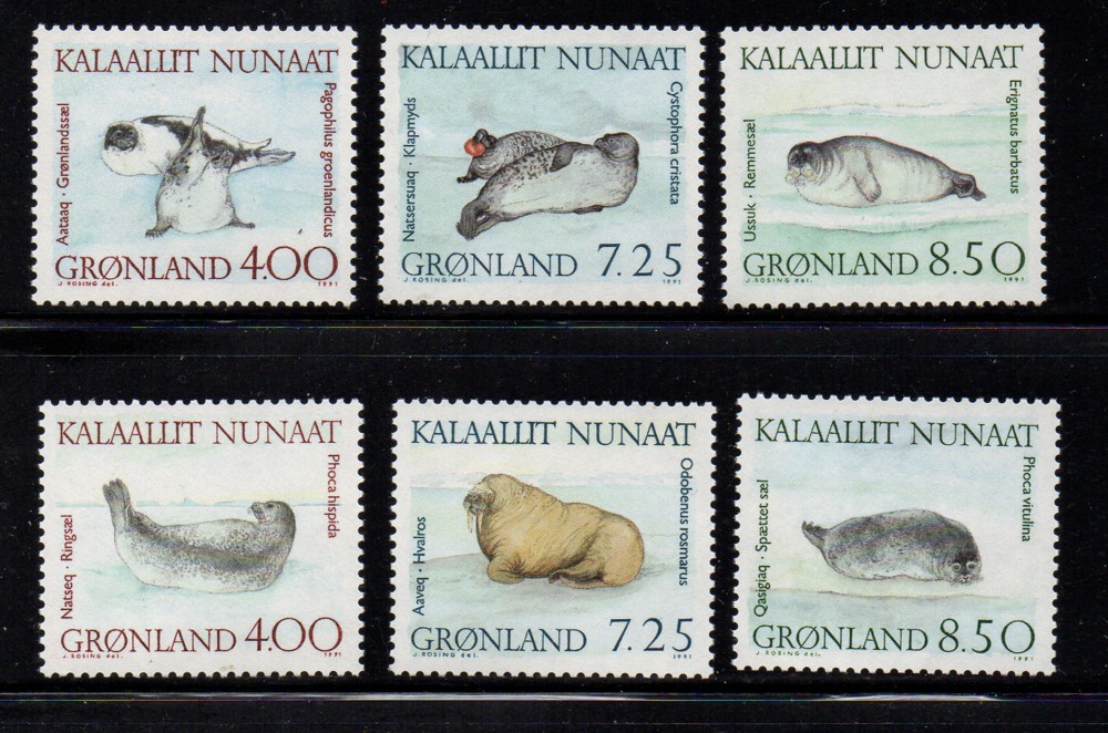 Greenland Scott Catalogue number 233-238 1991 Walrus & Seals stamp set .Mint, fine to very fine , original gum never hingedCanadian Customers - I pay the GST/HST on your purchases from me ..