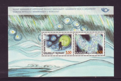 Greenland Scott Catalogue number 428a 2004 Norse Mythology stamp souvenir sheet .Mint, fine to very fine, original gum never hinged  .Member Canadian Stamp Dealers Association .Free Shipping on purchases over $50 going to Canada or the USA .Canadian Customers - I pay the GST/HST on your purchases from me .