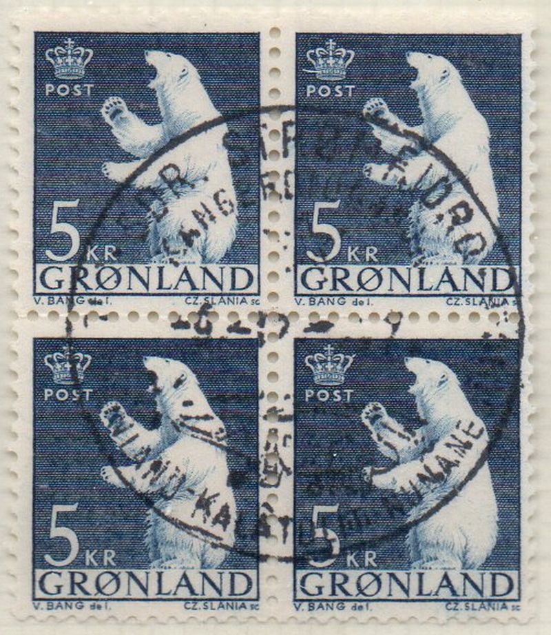 Greenland Scott Catalogue number 64 1963 5 kr Polar Bear block of 4 .Used, fine to very fine . Member Canadian Stamp Dealers Association .Canadian Customers - I pay the GST/HST on your purchases from me .25-8-62.jpg