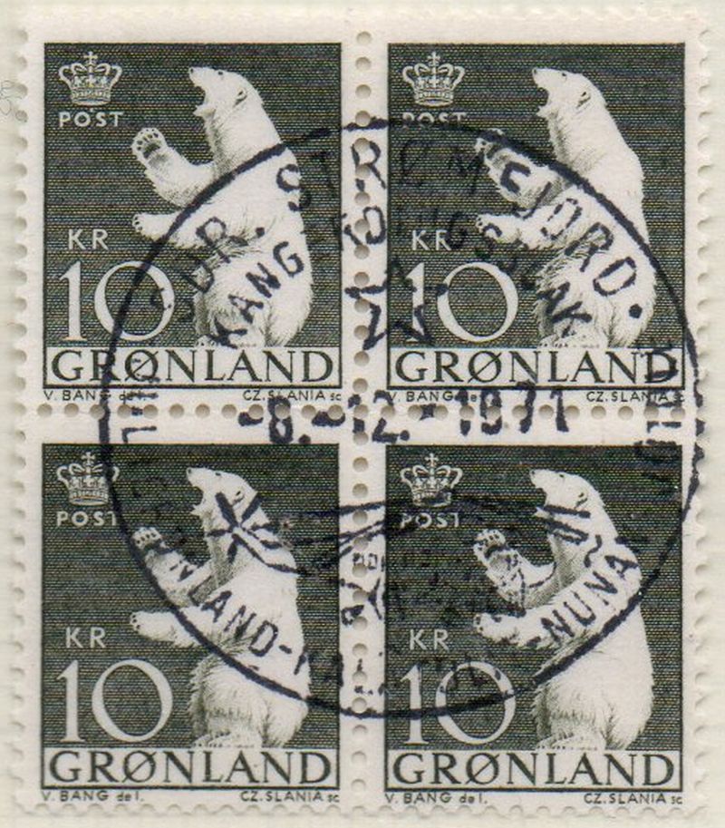 Greenland Scott Catalogue number 65 1963 10 kr Polar Bear block of 4 .Used, fine to very fine . Member Canadian Stamp Dealers Association .Canadian Customers - I pay the GST/HST on your purchases from me .25-8-64.jpg