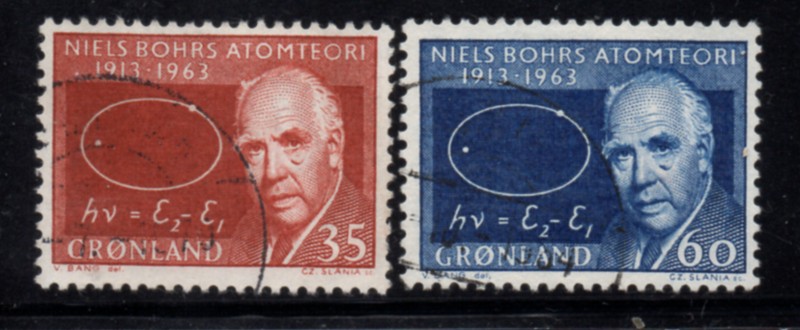 Greenland Scott Catalogue number 66-67 196 Niels Bohr stamp set.Used, fine to very fine .Canadian Customers - I pay the GST/HST on your purchases from me .Member Canadian Stamp Dealers Association