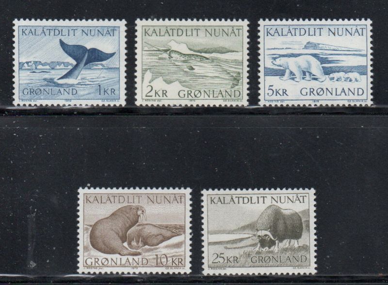 Greenland Scott Catalogue number 71-75 1969-1976 Wildlife stamp set .Mint, fine to very fine original gum never hinged .Canadian Customers - no added GST/HSTUS customers - No tariffs on stamps sent by meMember Canadian Stamp Dealers Association