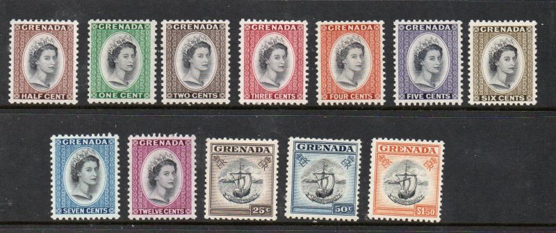 Grenada Scott Catalogue number 171-182 1953-1955 QE II long stamp set to $1.50 value Mint, fine to very fine, original gum hinged .Member Canadian Stamp Dealers Association .Canadian Customers - I pay the GST/HST on your purchases from me .25-6-119.jpg