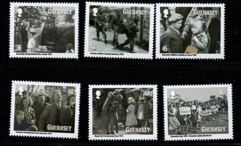 Guernsey Scott Catalogue number 1099-1104 2010 70th Anniversary Evacuation of Guernsey stamp set .Mint, fine to very fine, original gum never hinged .Member Canadian Stamp Dealers Association .Canadian Customers - I pay the GST/HST on your purchases from me .