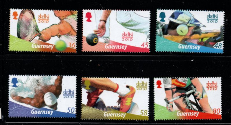 Guernsey Scott Catalogue number 1105-1110 2010 Commonwealth Games stamp set .Mint, fine to very fine, original gum never hinged .Member Canadian Stamp Dealers Association .Canadian Customers - I pay the GST/HST on your purchases from me .