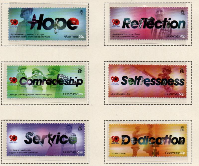 Guernsey Scott Catalogue number 1118-1123 2011 90th Anniversary Royal British Legion stamp set .