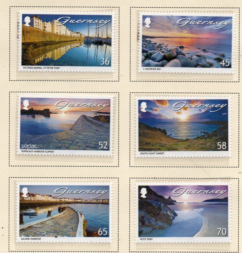 Guernsey Scott Catalogue number 1136-1141 2011 Seaside Views stamp set . Mint, fine to very fine, original gum never hinged .Member Canadian Stamp Dealers Association .Canadian Customers - I pay the GST/HST on your purchases from me .