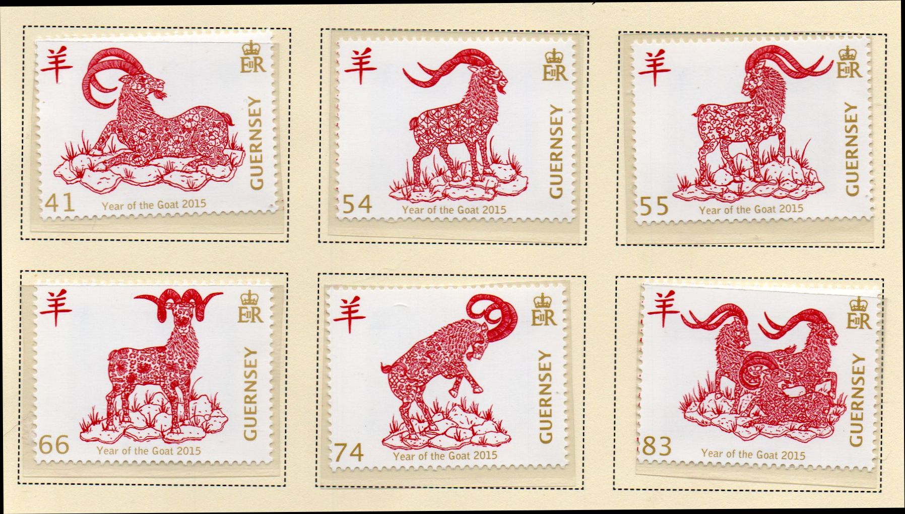 Guernsey Scott Catalogue number 1282-1287 2015 Year of the Goat stamp set .Mint, fine to very fine, original gum never hinged .Member Canadian Stamp Dealers Association .Canadian Customers - I pay the GST/HST on your purchases from me .