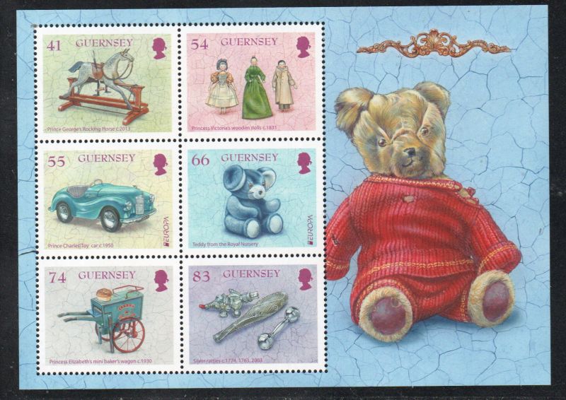 Guernsey Scott Catalogue number 1293a 2015 Royal Family Toys stamp souvenir sheet .Mint, fine to very fine, original gum never hinged .Member Canadian Stamp Dealers Association .Canadian Customers - I pay the GST/HST on your purchases from me .