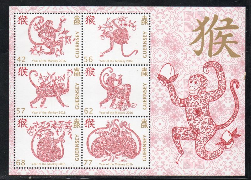 Guernsey Scott Catalogue number 1331a 2016 Year of the Monkey stamp souvenir sheet .Mint, fine to very fine, original gum never hinged .Member Canadian Stamp Dealers Association .Canadian Customers - I pay the GST/HST on your purchases from me .