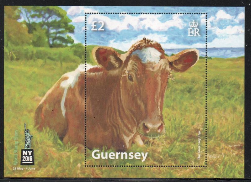 Guernsey Scott Catalogue number 1344 2016 £3 Guernsey Cow stamp souvenir sheet .Mint, fine to very fine, original gum never hinged .Member Canadian Stamp Dealers Association .Canadian Customers - I pay the GST/HST on your purchases from me .