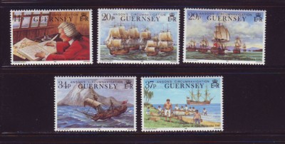 Guernsey Scott Catalogue number 436-440 1990 250th Anniversary Anson's Circumnavigation stamp set .Mint, fine to very fine, original gum never hinged .Member Canadian Stamp Dealers Association .Free Shipping on purchases over $50 going to Canada or the USA .Canadian Customers - I pay the GST/HST on your purchases from me .
