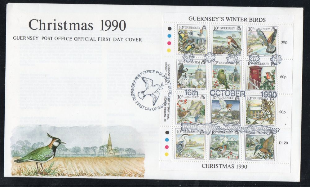 Guernsey Scott Catalogue number 445 1990 Christmas Winter Birds stamp sheet .