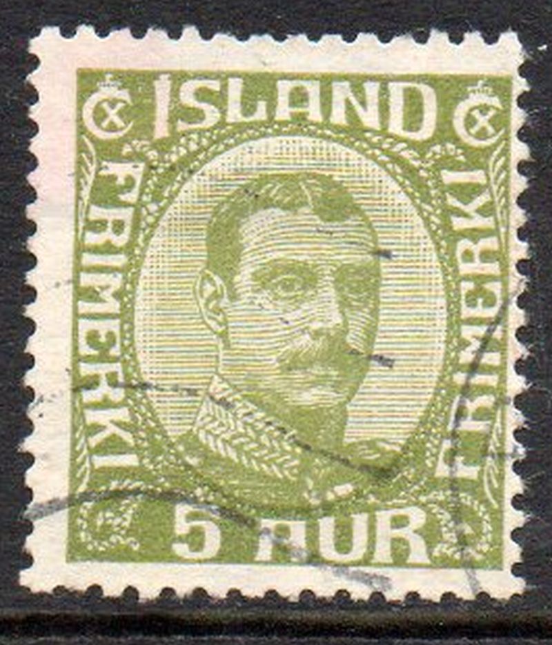 Iceland Scott Catalogue number 112 1920 5 aur olive green Christian X stamp.Used, very good to fine .Canadian Customers - No added GST/HST on your purchases from me .26-1-6.jpg