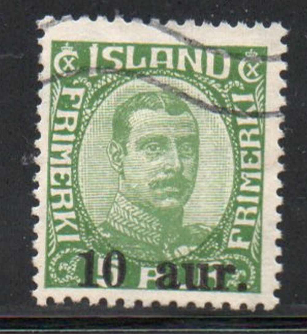 Iceland Scott Catalogue number 139 1922 10aur overprint on 5 aur green Christian X stamp.Used, fineCanadian Customers - I pay the GST/HST on your purchases from me .19-8-22.jpg